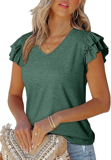 Women's Casual Ruffle Short Sleeve Tops Cute Solid Color Knit Ribbed T Shirts Blouses