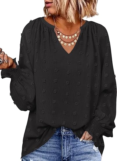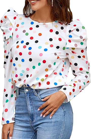 Long Sleeve Shirts for Women Swiss Dot Puff Sleeve Pleated Fall Tunic Tops Crew Neck Dressy Casual Blouses