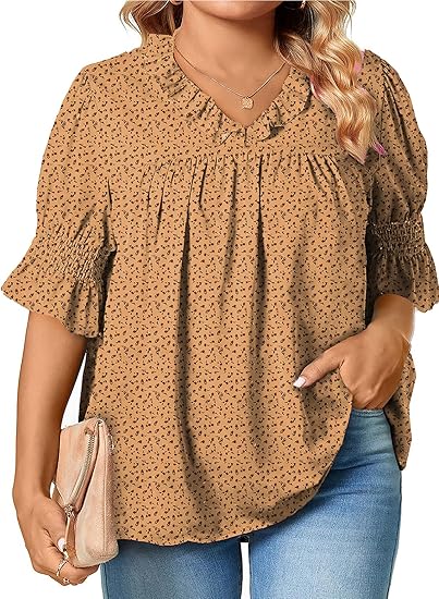 Womens Plus Size Floral Print Blouses V Neck Ruffle Flowy Short Sleeve Shirts Babydoll Casual Tunic Tops(1X-5X)