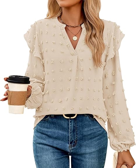 Womens Ruffle Long Sleeve Chiffon Blouses V Neck Swiss Dot Fall Shirts Dressy Casual Tunic Tops