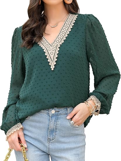 Womens Long Sleeve Eyelet Tops Dressy Casual Blouse Lace Trimmed V Neck Shirt 2024 Fall Outfit Clothes