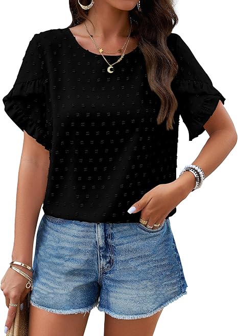 Women's Tops 2024 Summer Ruffle Short Sleeve Crewneck Blouses Swiss Dots Solid Loose Tunics Work Shirts