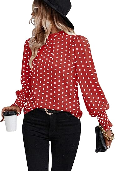 Women's Polka Dots Blouse Puff Ruffle Long Sleeve Shirts 2024 Fall Pleated Frill Trim Mock Neck Tunic Tops