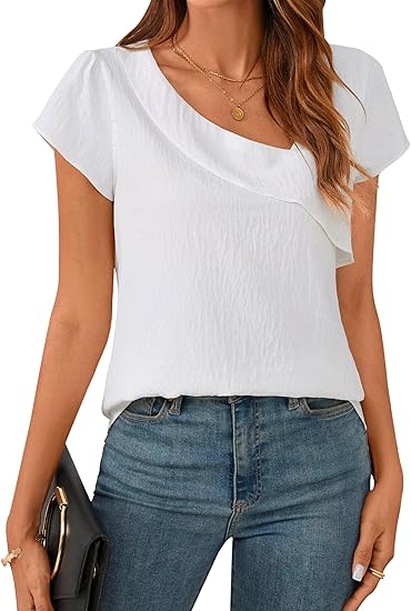 Womens Dressy Casual Blouses Asymmetrical V Neck Business Work Tops Ruffle Sleeve Summer Shirts
