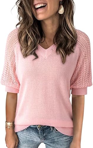 Women's Casual Short Sleeve Loose Crochet Tunic Tops Lightweight Knit Pullover Sweater Blouses