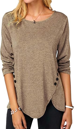 Womens Casual Long Sleeve Tunic Shirts Round Neck Button Side Blouses Tops