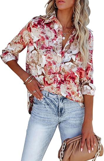 Womens Button Down Shirts Dress Shirts Long Sleeve Wrinkle Free Collared Work Blouses Casual Print Chiffon Top