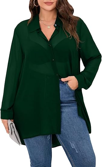 Women's Plus Size Chiffon Button Down Blouse Long Sleeve High Low Button Up Shirt