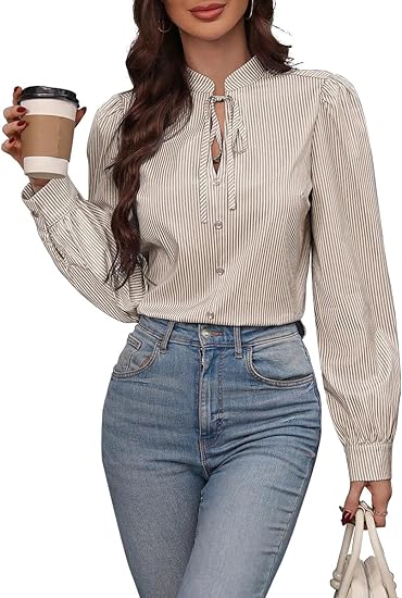 Blouses for Women Dressy Casual Striped Print Button Down Shirts Tie Neck Shirts for Women Lantern Sleeve Blouse