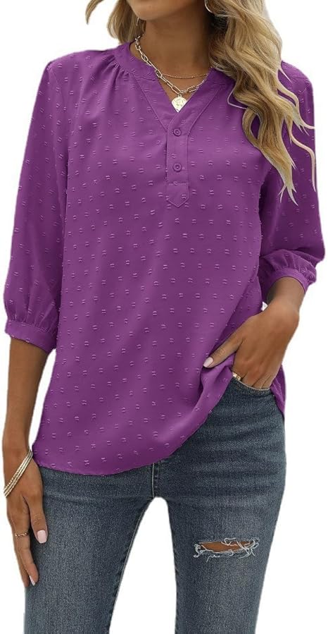 Womens V Neck Button Half Sleeve Blouse Dressy Casual FlowyTops Swiss Dot Shirts