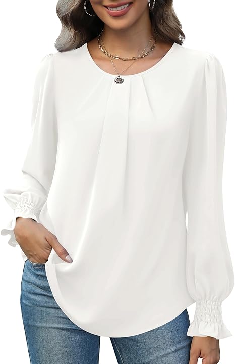 Womens Tops Dressy Casual Smocked Long Sleeve Shirts Crew Neck Loose Chiffon Tunics Office Work Blouses