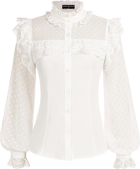 Women's Victorian Lace Tops Polka Dot Button Down Long Sleeve Shirt