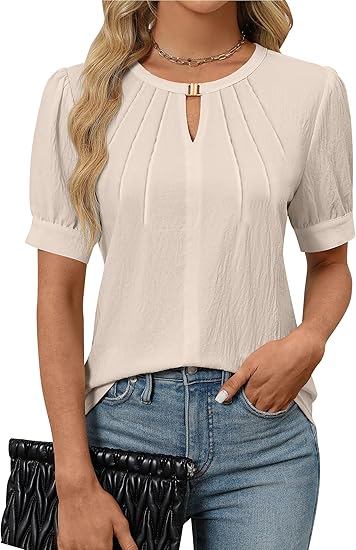 Womens Dressy Casual Tops Keyhole Business Work Blouses Pleated Puff Sleeve Summer Shirts