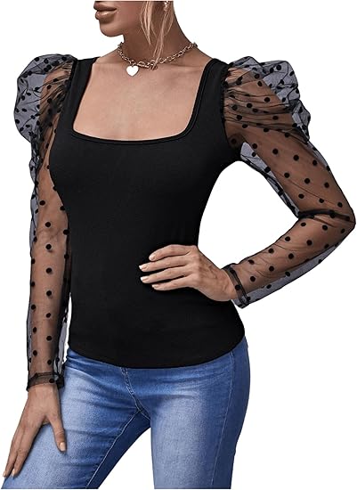 Women's Polka Dots Mesh Puff Long Sleeve Blouse Square Neck Elegant Blouses Top