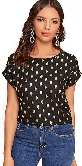 Women's Elegant Polka Dots Print Short Cap Sleeve Blouse Round Neck Tee Top