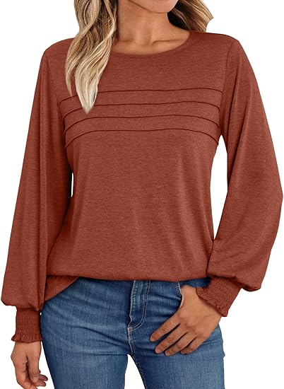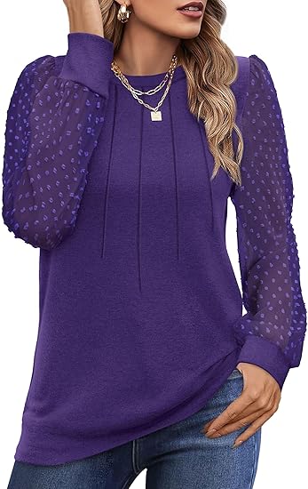 Long Sleeve Shirts for Women Swiss Dot Puff Sleeve Pleated Fall Tunic Tops Crew Neck Dressy Casual Blouses