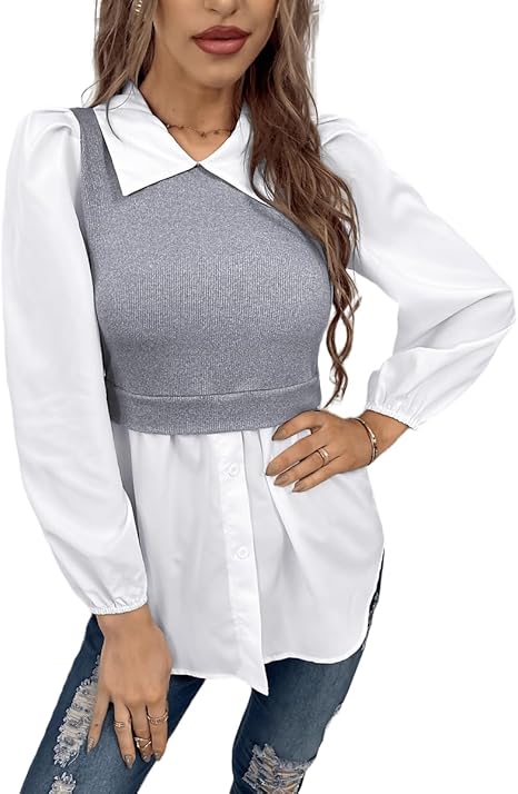 Women's Patchwork Button Down Shirt Long Sleeve Collared 2 in 1 Style Ribbed Pullover Peplum Tops Blouse