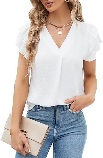 Womens Dressy Chiffon Blouses Summer Puff Petal Short Sleeve Shirts V Neck Casual Work Tops
