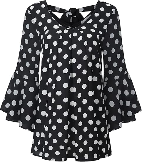 Women's Cute V Neck 3/4 Bell Sleeve Pleated Front Chiffon Blouse