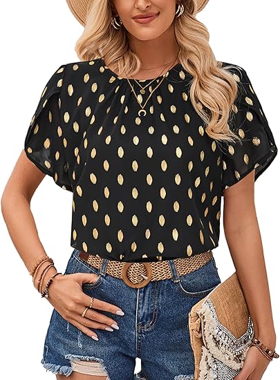 Women's Polka Dot Blouse Short Sleeve Chiffon Pleated Crew Neck Summer Casual Shirt