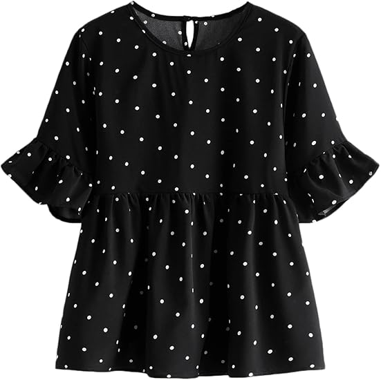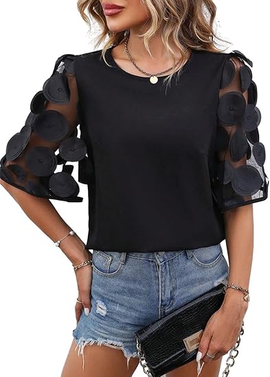 Women’S Half Polka Dot Sheer Mesh Sleeve Top Solid Loose Cute Summer Blouse Shirt Tops Dressy Casual Black S