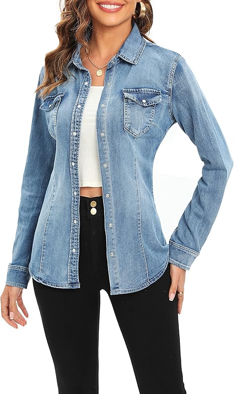 Denim Shirt for Women Long Sleeve Cotton Lightweight Fashion Denim Jacket for Women-2 Pockets
