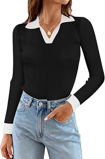 Women's 2024 Fall Long Sleeve V Neck Shirts Trendy Casual Ribbed Knit Sweater Tee Tops