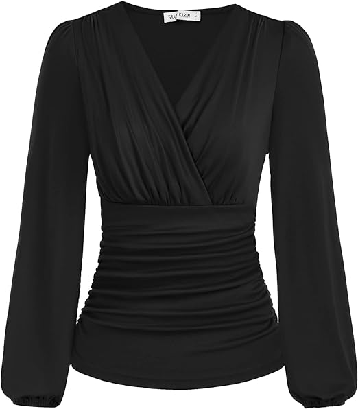 2024 Womens Tops Elegant Wrap Blouse V Neck Work Shirts Fall Fashion Long Sleeve Dressy Casual Ruched Top