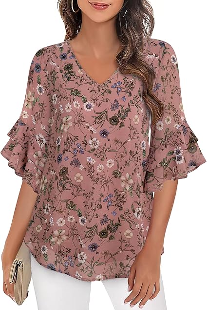 Women's Dressy Tops Balloon Long Sleeve Blouse V Neck Casual Floral Loose Shirts