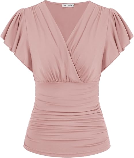 2024 Womens Tops Summer Wrap Blouse V Neck Ruffle Sleeve Dressy Casual Top Ruched T-Shirts