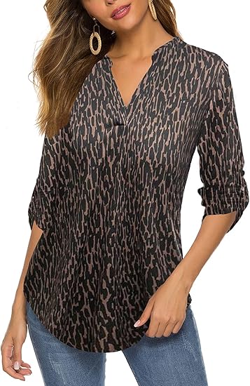 Women's Roll Up 3/4 Sleeve Floral Print V Neck Tunic Blouses Tops Shirts