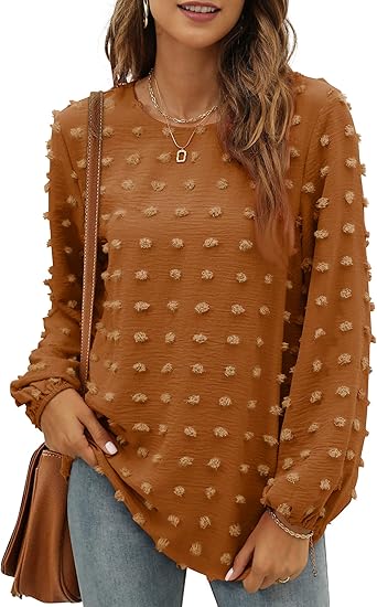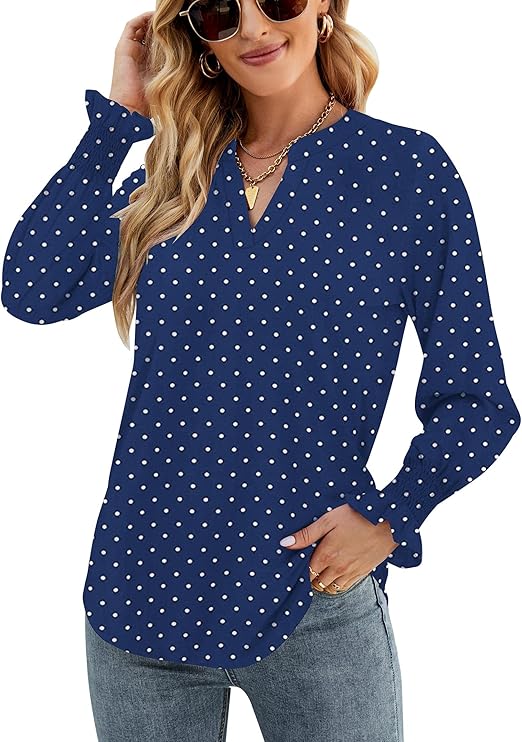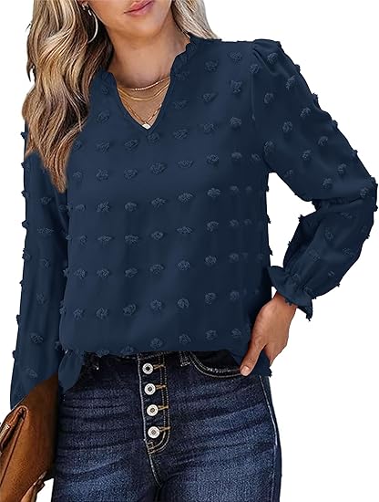 Womens Swiss Dot Blouse Puff Long Sleeve Shirts V Neck Dressy Casual Polka Dot Tunic Tops Chiffon Business Pompom Tops