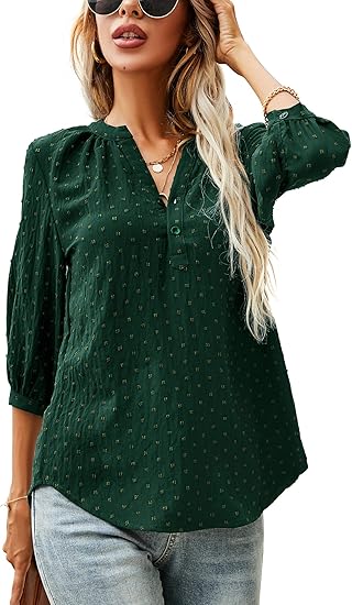 Women's Casual 3/4 Sleeve Henley V-Neck Button Up Pleated Back Blouses Swiss Dot Blouse Tops T-Shirts S-XXL