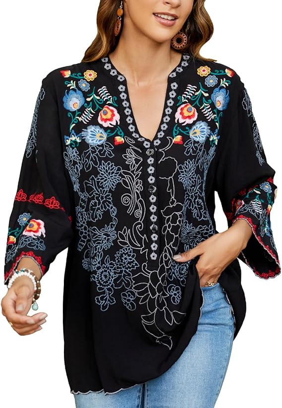 Mexican Shirts Peasant Blouses Cotton Embroidered 3/4 Sleeve V Neck Tunic Bohemian Tops Boho Clothes for Women