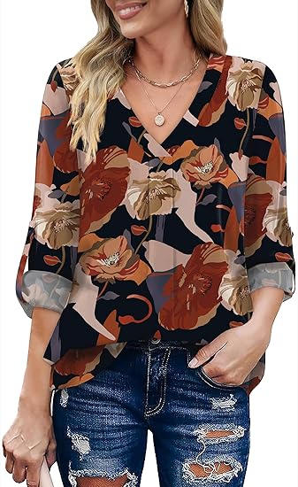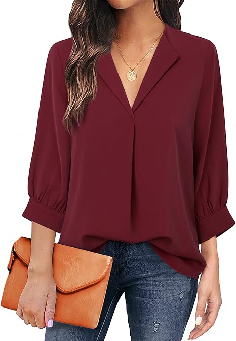3/4 Sleeve Blouses for Women Business Casual V Neck Chiffon Shirts Tops